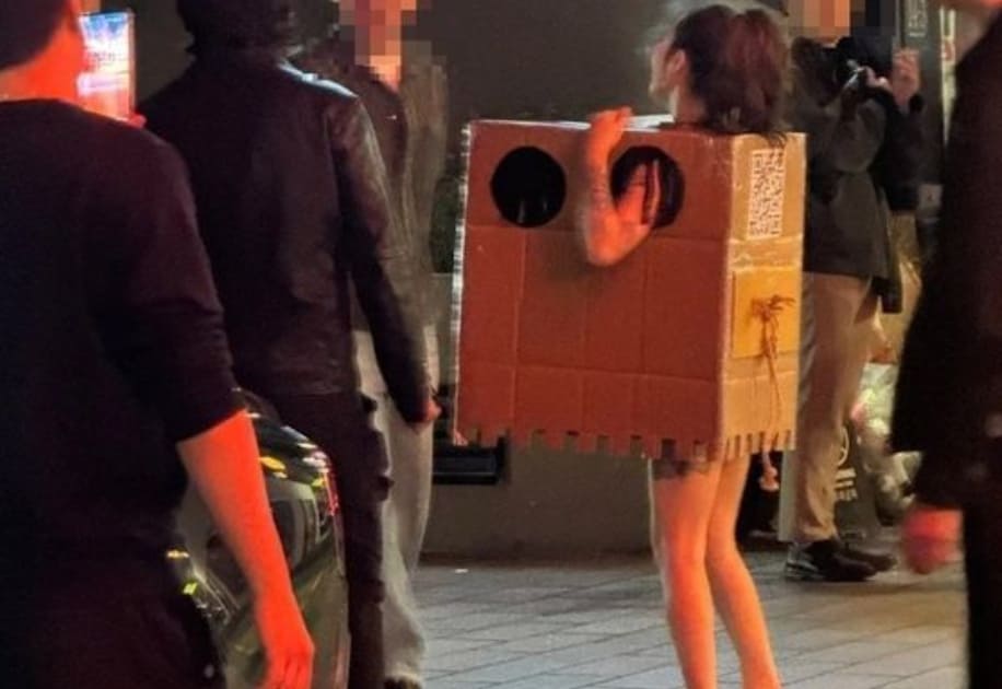 나체 상태로 박스를 몸통에 두르고 도심에 나타난 해당 여성은 이른바 에인절박스녀라 불리는